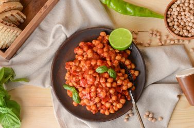 - מוסיפים את גרגרי החומוס, רסק העגבניות, המים והמערבבים.